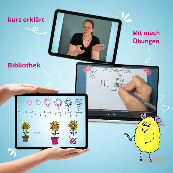 Aber Achtung, hier ist eine bunte Mischung von Beginner bis Fortgeschrittene. Das Buch "Der kreative Sketchnotes Workshop für Kinder" und mein Kurs "Einfach zeichnen lernen mit Sketchnotes" fängt natürlich ganz von vorne mit den Grundlagen an!