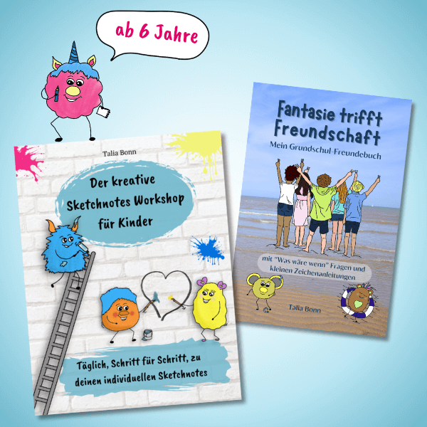 Na mit meinem Sketchnoteskurs "Einfach zeichnen lernen mit Sketchnotes" oder den kreativen Mitmachbüchern! So wird der Weg zu den eigenen Sketchnotes, Texten und Träumen kinderleicht und das Beste, ganz nebenbei erlernt dein Kind Fähigkeiten wie z.B. seine eigene Kreativität zur Problemlösung zu nutzen, die auch im späteren Berufsleben sehr gefragt sind.