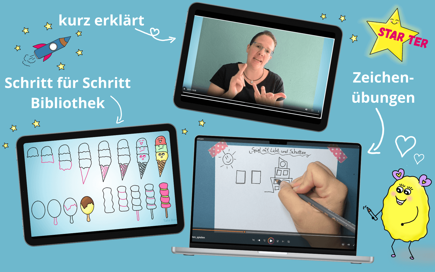 Egal, ob du oder dein Kind schon mal Sketchnotes gezeichnet haben oder gerade erst anfangt kreativ zu sein: In meinen Kursen und Büchern werdet ihr neue, aufregende Techniken und Fantasien entdecken, euch entspannen und gleichzeitig Spaß haben, ohne dass euch jemand vorschreibt, wie ihr es zu machen habt!