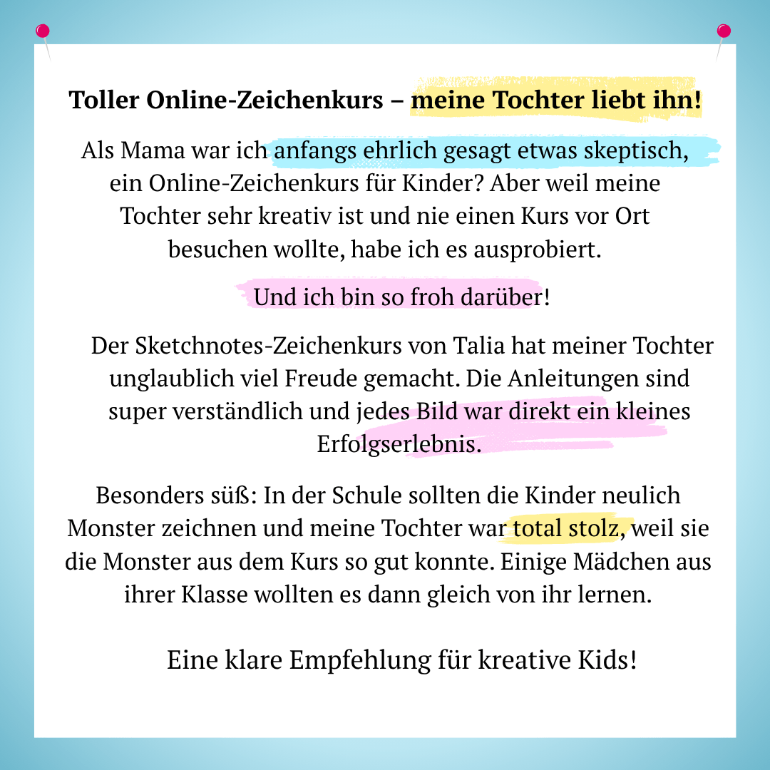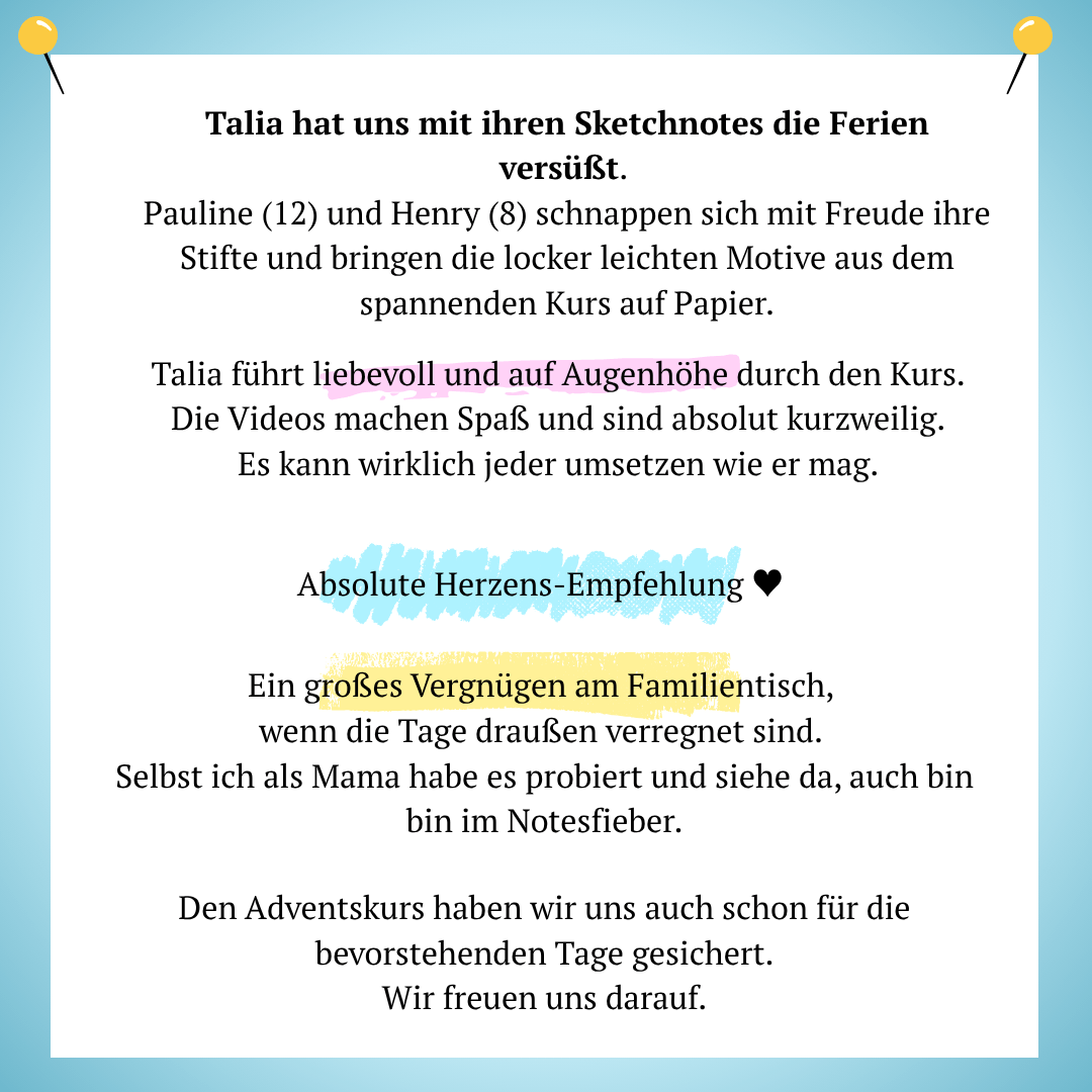 Mit dem Zeichnen von Sketchnotes zu beginnen ist der erste Schritt in Richtung eines kreativen, fantasievollen, entspannten und humorvollen Lebens für dein Kind!