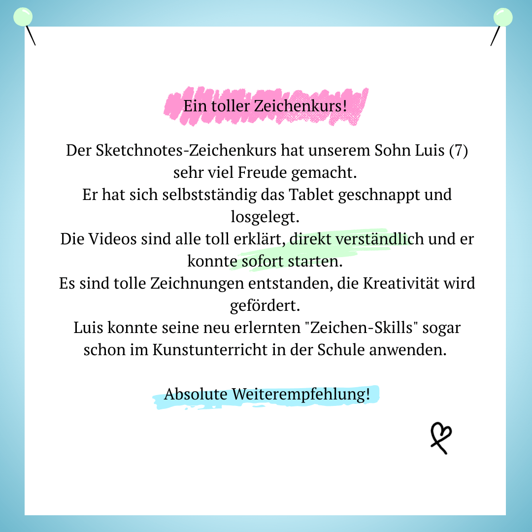 Erwartest du allerdings naturgetreues realistisches Zeichnen oder bist schon Profi, dann gibt es Kurse die besser zu dir passen. Hier geht es um den einfachen Einstieg in die Welt des Zeichnens ohne realistischen Perfektionsdruck.